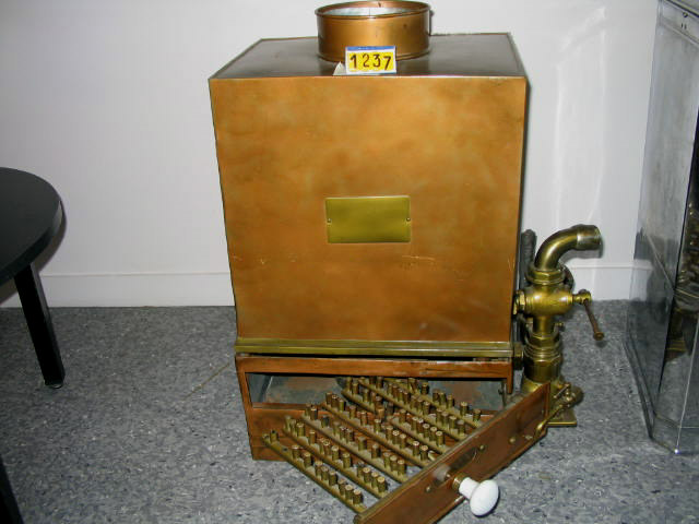 Description: 5 becs. Noir. A cloches droites et tiroirs. Les inconvénients majeurs du compteur à eau (gel, évaporation) sont éliminés. Le 1er compteur à garde d'huile a été utilisé en 1919 par la Compagnie des Ccmpteurs