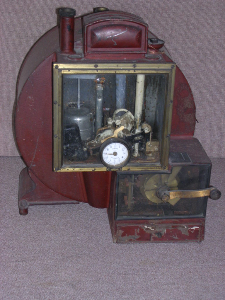 Description: Compteur hydraulique de démonstration "ordinaire" à paiement préalable. 5 becs-pour enregistrer le débit du gaz consommé - Couleur: rouge Bordeaux Il a, pour organe essentiel, un "volant" divisé en 4 chambres d'égale capacité, tournant autour d'un axe et plongeant dans de l'eau placée dans une caisse cylindrique formant le "corps" extérieur du compteur. Un tube à coude amène le gaz dans la caisse alors qu'on a ouvert le ou les robinets d'alimentation des appareils à gaz. La différence de pression entre l'atmosphère et le gaz provoque la rotation du volant. Chaque chambre se remplit de gaz qu'elle déverse chez l'abonné. Le remplissage et le désemplissage des chambres se mesurent au nombre de tours grâce à des engrenages entraînant des aiguilles sur des cadrans gradués.