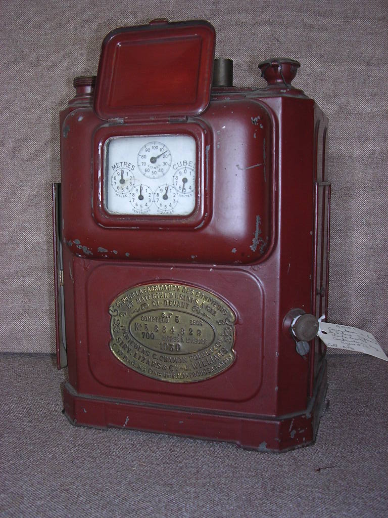 Description: 8 becs -pour enregistrer le gaz consommé par la clientèle. Couleur: rouge Bordeaux. A cloches droites et tiroirs. Le premier compteur à garde d'huile a été construit en 1919 par la Compagnie des compteurs. Les inconvénients majeurs du compteur à eau (gel, évaporation) sont éliminés.