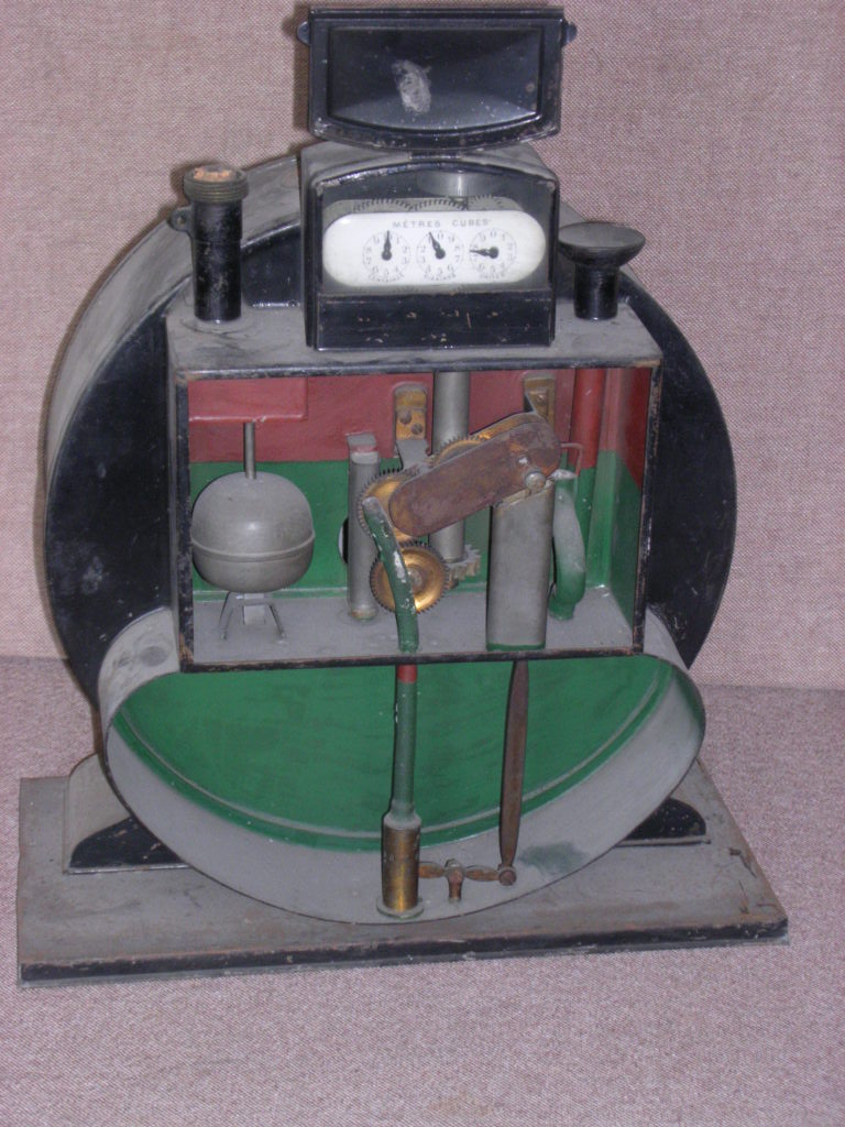 Description: Compteur hydraulique de démonstration. Couleur: noir. 5 becs-pour enregistrer le débit du gaz consommé par la la clientèle. Il a, pour organe essentiel, un "volant" divisé en 4 chambres d'égale capacité, tournant autour d'un axe et plongeant dans de l'eau placée dans une caisse cylindrique formant le "corps" extérieur du compteur. Un tube à coude amène le gaz dans la caisse alors qu'on a ouvert le ou les robinets d'alimentation des appareils à gaz. La différence de pression entre l'atmosphère et le gaz provoque la rotation du volant. Chaque chambre se remplit de gaz qu'elle déverse chez l'abonné. Le remplissage et le désemplissage des chambres se mesurent au nombre de tours grâce à des engrenages entraînant des aiguilles sur des cadrans gradués.