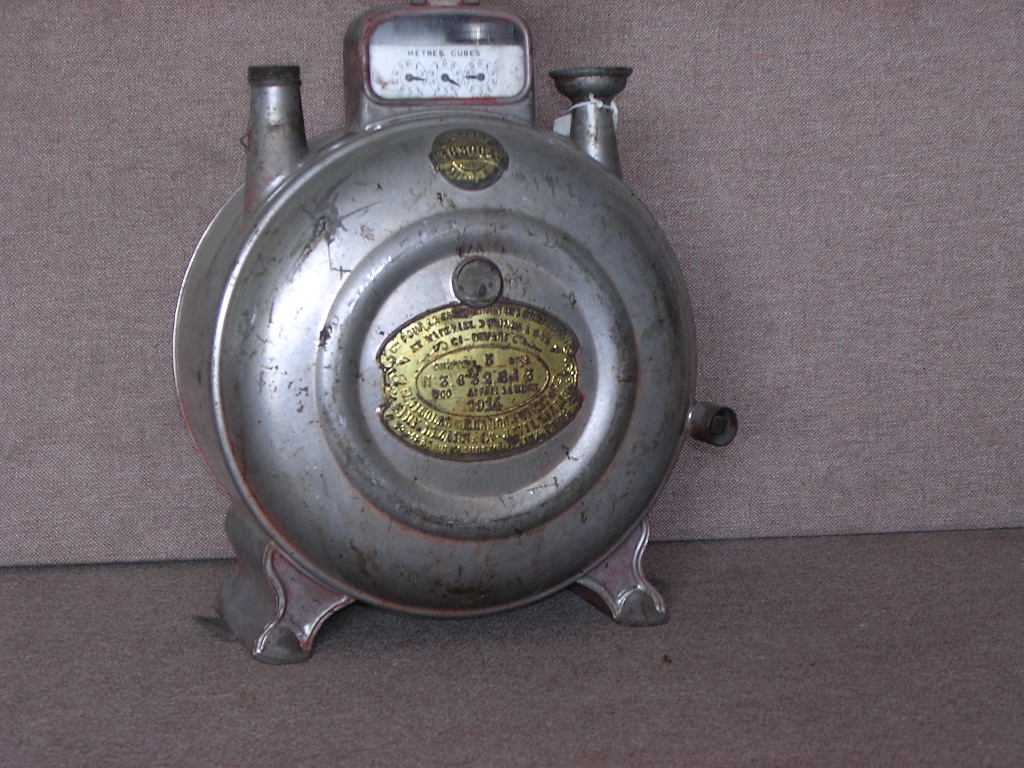 Description: 5 becs. Gris métallisé. A pour organe essentiel un "volant" divisé en 4 chambres d'égale capacité tournant autour d'un axe et plongeant dans de l'eau placée dans une caisse cylindrique formant le corps extérieur du compteur. Un tube à coude amène le gaz dans la caisse alors que l'on a ouvert le ou les robinets d'alimentation des appareils à gaz. La différence de pression entre l'atmosphère et le gaz provoque la rotation du volant. Chaque chambre se remplit de gaz qu'elle déverse chez l'abonné. Le remplissage et le désemplissage des chambres se mesurent au nombre de tours au moyen d'engrenages qui font mouvoir des aiguilles sur des cadrans gradués. Don de l'association MEGE.
