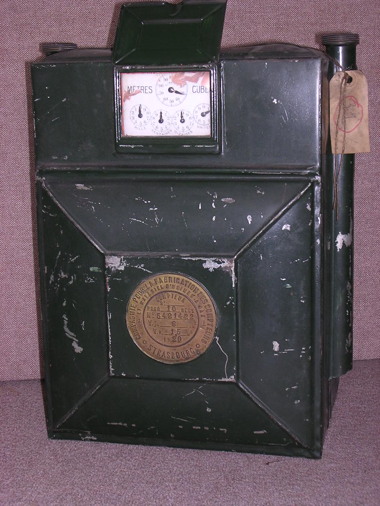 Description: 10 becs vert foncé. Son principe est basé sur la capacité mesurante de soufflets alternativement remplis et vidés. Le mouvement oscillatoire des parois est transmis à des cadrans de mesure qui enregistrent ainsi les quantités de gaz qui traversent l'appareil. Don de l'association MEGE.
